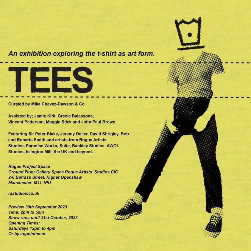 Tees is a group exhibition curated by Mike Chavez-Dawson and Co. exploring the t-shirt as an artform, a form of self expression and a symbol of protest. As someone who regularly used to make their own t-shirts as a quick and easy response to political moments or to quickly realise an artistic idea, I have long be fascinated by the flexibility of the t-shirt as a direct form of self expression; the idea of wearing your heart or your politics on your sleeve (or more accurately on your chest) holds a universal appeal. There are some amazing artists included in this show including Peter Blake, Jeremy Deller and Bob and Roberta Smith to name just a few, more excitingly there are a massive range of artists who have taken this brief and ran with it in every direction all at once! I will be reading a new piece ” The Complete and Unabridged History of Fire” at the preview at 3.30pm on 30/9/23 Be there, buy the t-shirt!