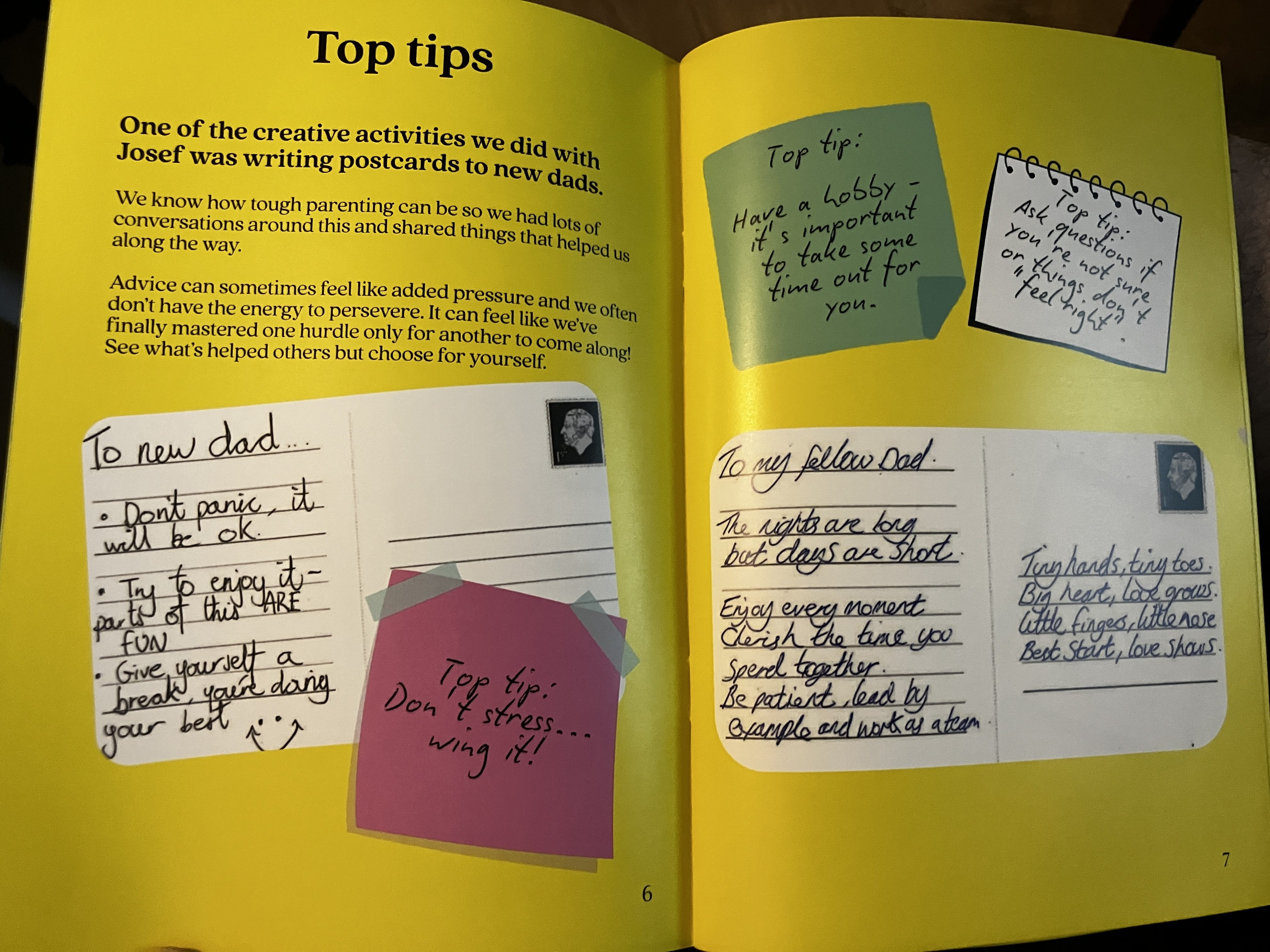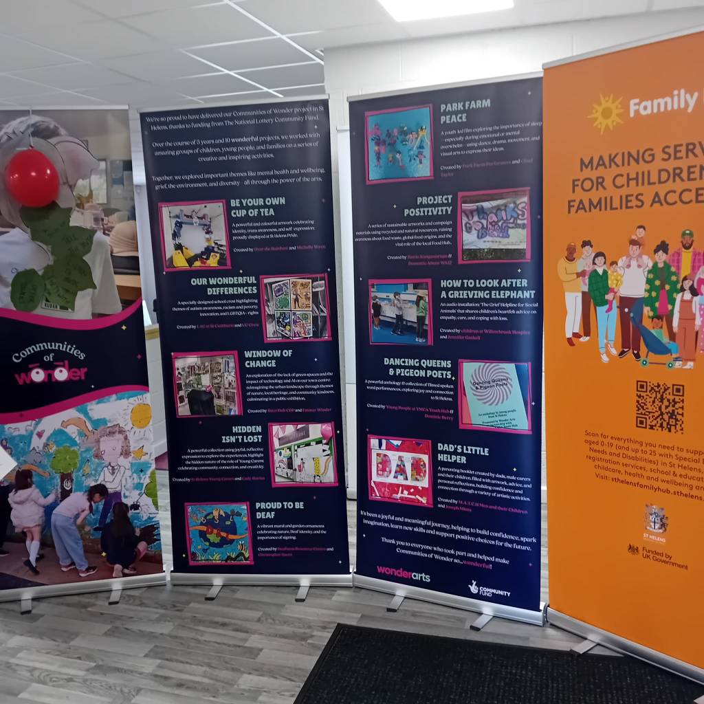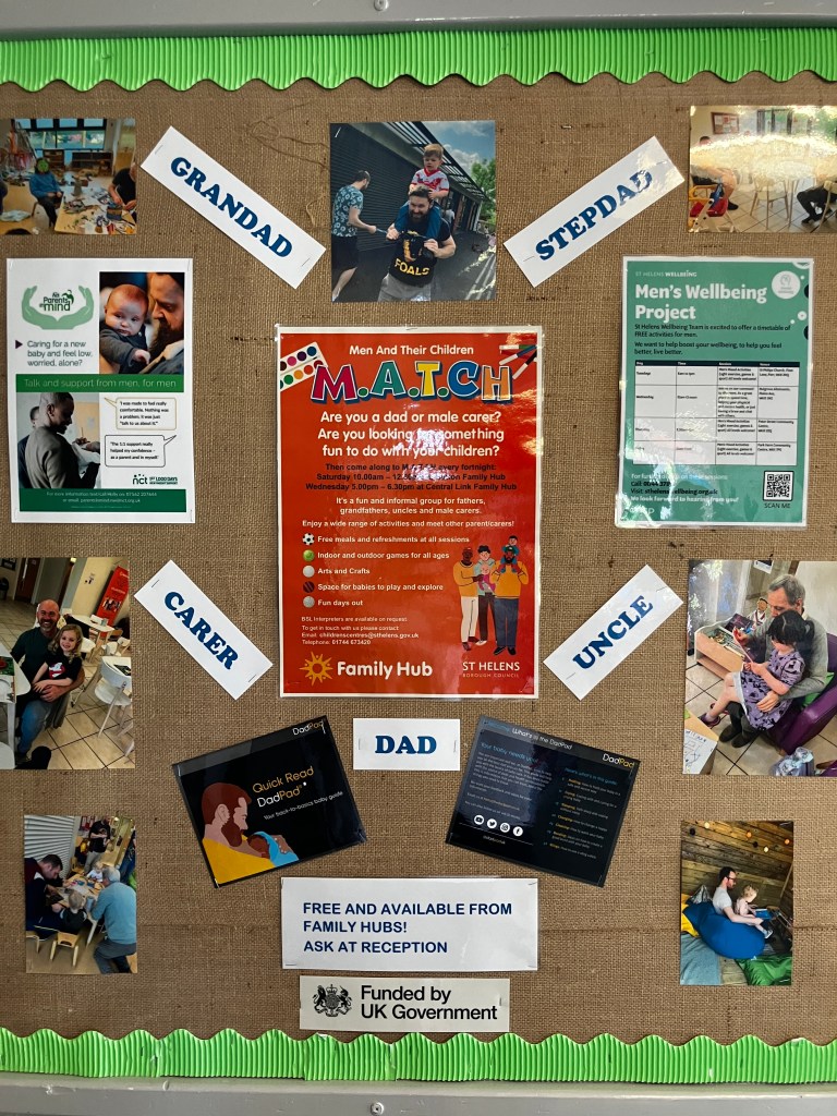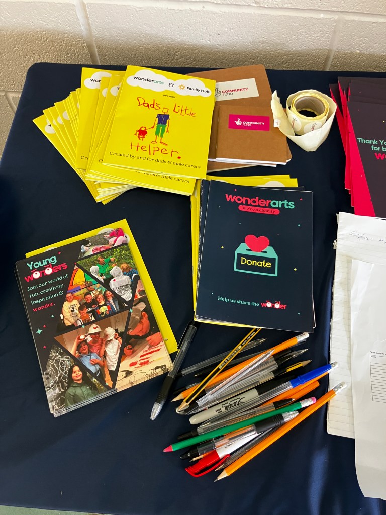 It has been a real pleasure to work with MATCH (Men and Their Children) in St Helens to produce a booklet to support other new dads and carers. Meeting every two weeks at Family Hubs in St Helens we have created art, talked and shared the ups and downs of being a new dad. Making something and having a drop-in activity for the kids was a great structure to allow space and time to share and a part of my practice I will continue to develop. Dads talked about their uncertainty, health worries and concerns about children and partners, and the conflict of wanting to help raise their kids while also working to provide for them. I was really bowled over by the welcome I received and how willing these men were to talk about how they were feeling; good and bad. I never felt that support was there when I was a new dad and it’s really encouraging that these spaces exists and that the men there want to do something to help others; there is hope and positivity there and evidence of people building the communities of support they need around them and welcoming all in. They have produced a helpful and tangible guide for other dads (which will be distributed at schools, hospitals, doctors surgeries and beyond) which might just provide a link for someone struggling to a community who are ready, willing and able to pitch in and support each other. The staff at the Family hubs are fantastic and made us all feel at home and the whole project was made possible by Wonderarts (especailly Emma wh worked with me on every sessions and was a constant source of support and excelletn chat and Danny who did such a great job creating the booklet) supported by the National Lottery Community Fund